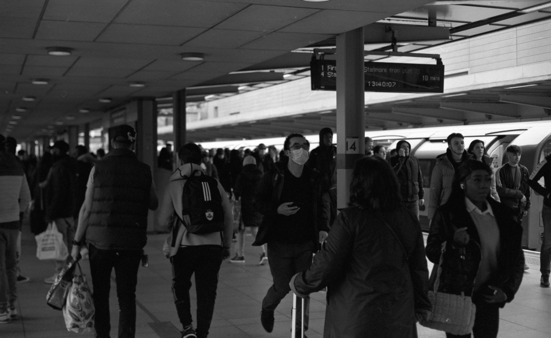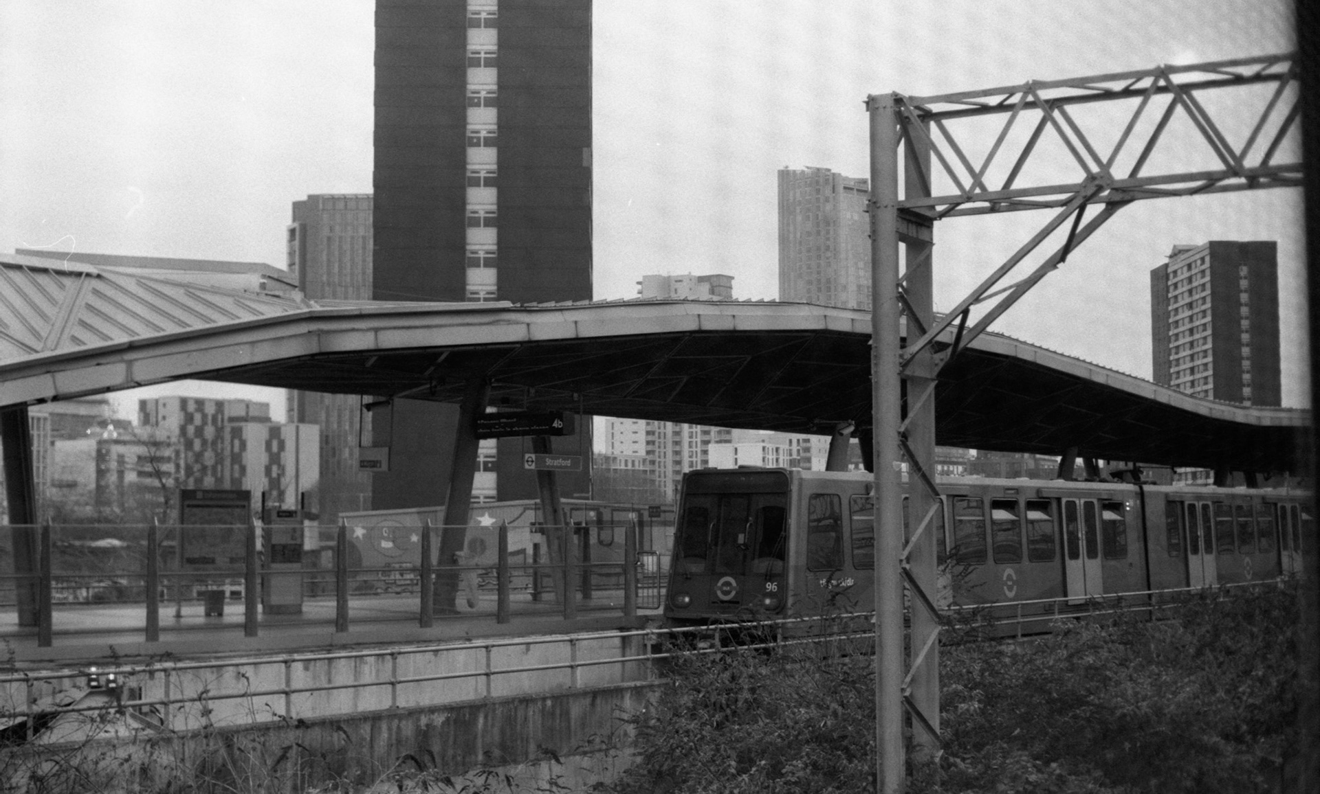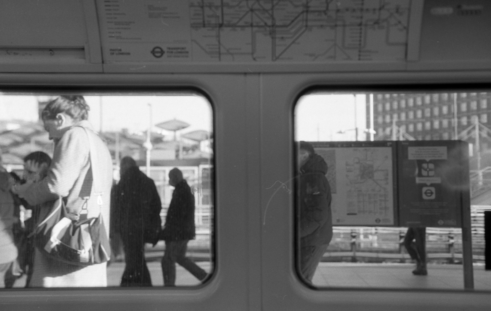 A collection of 35mm black-and-white photos exploring moving around London.